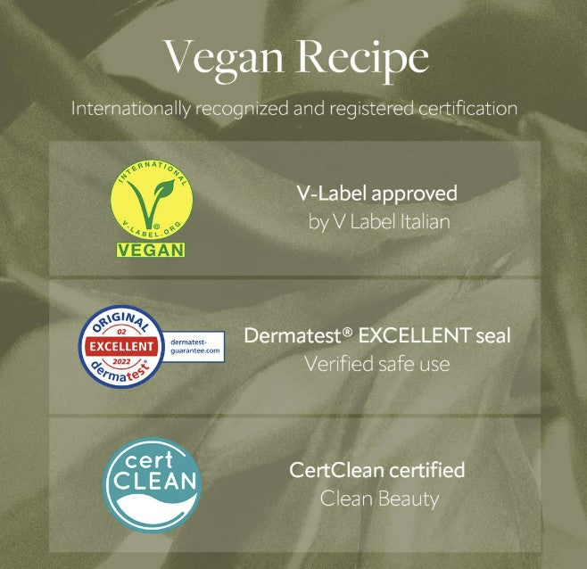Certified Vegan after meticulous testing by Italian V-label, Dermatest approved at excellent level, and CerClean certified for clean formula.