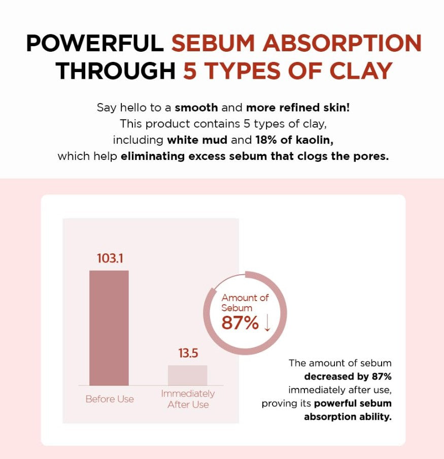 - Contains 5 types of clay, including 18% high-density kaolin, which reduces sebum production by 87% with just one application.