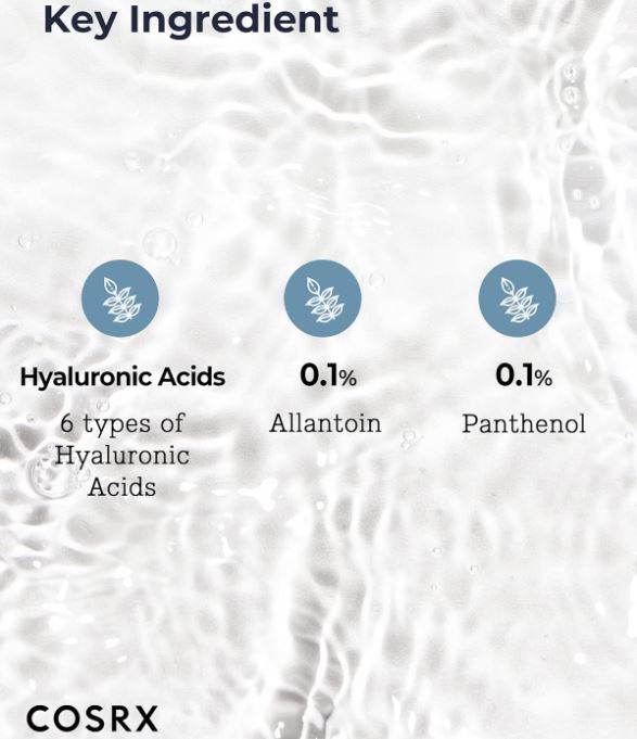 Key Ingredient: 6 types of Hyaluronic Acids, 0.1% Allantoin, 0.1% Panthenol (Vitamin B5).