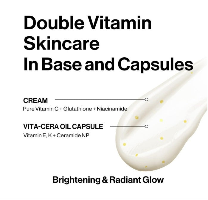 The vitamin E and K in the vita capsules care for dull and rough skin, making it clear and radiant.This brightening functional vitamin cream is packed with ingredients like vitamin C, glutathione, and 2% niacinamide for vita synergy, revitalizing and brightening the skin.