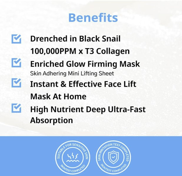 An anatomically comfortable skin lifting sheet mask containing black snail mucin extract and collagen T3 essence that fully wraps around and tightens the facial contours.