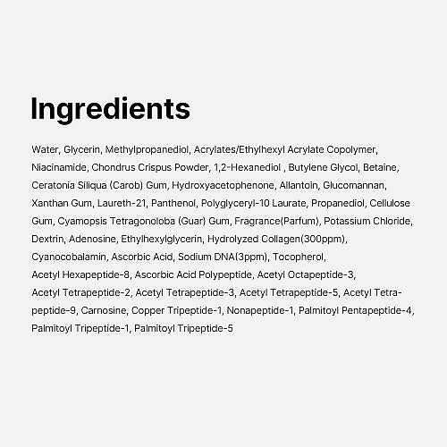 Advanced Formulation : Enriched with salmon PDRN and low-molecular collagen for healthy complexion and balanced skin tone.