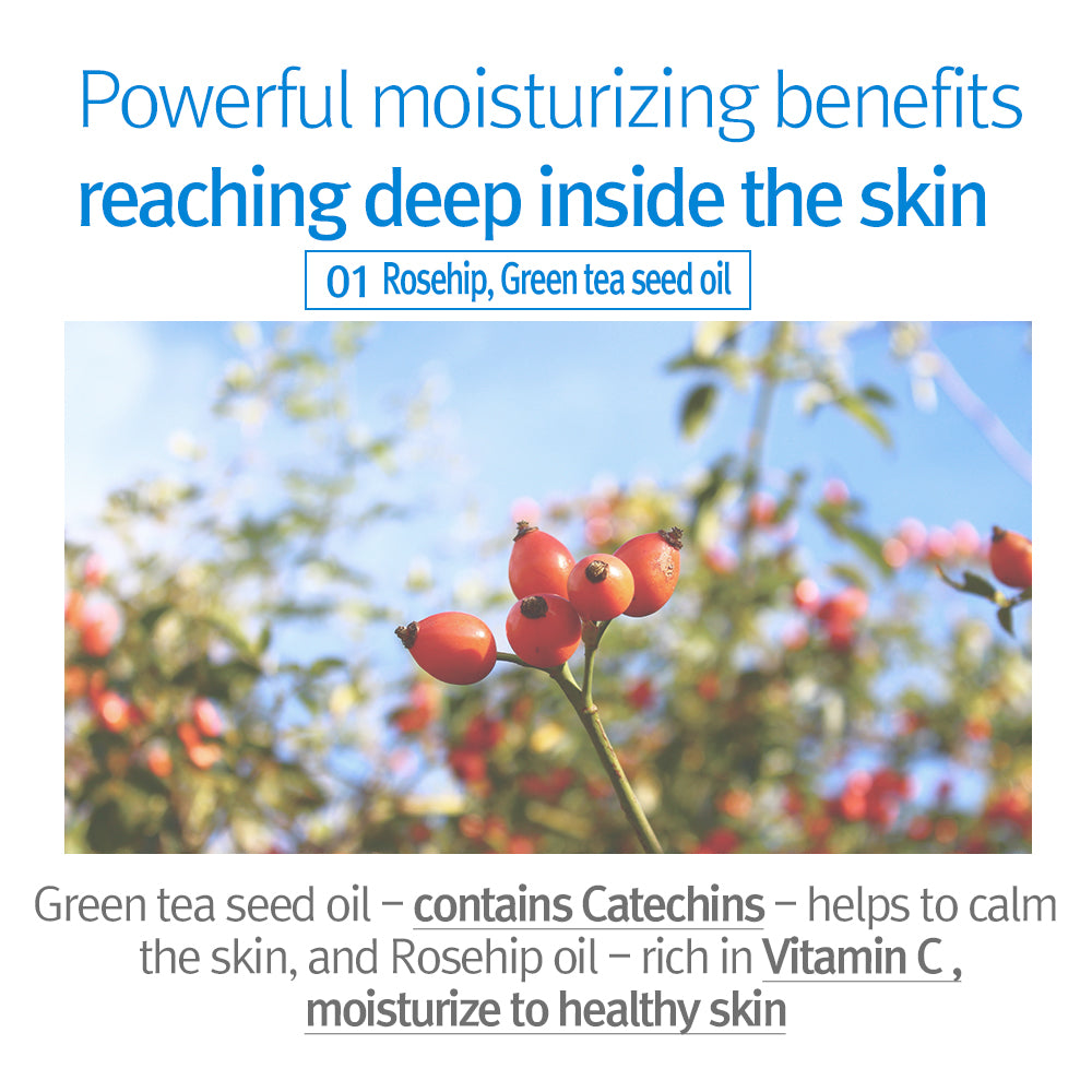 2. Strong moisturizing power that fills the skin deep: Rose hip and green tea seed oil for comfortable moisturizing of vitamin-rich plant-derived ingredients
