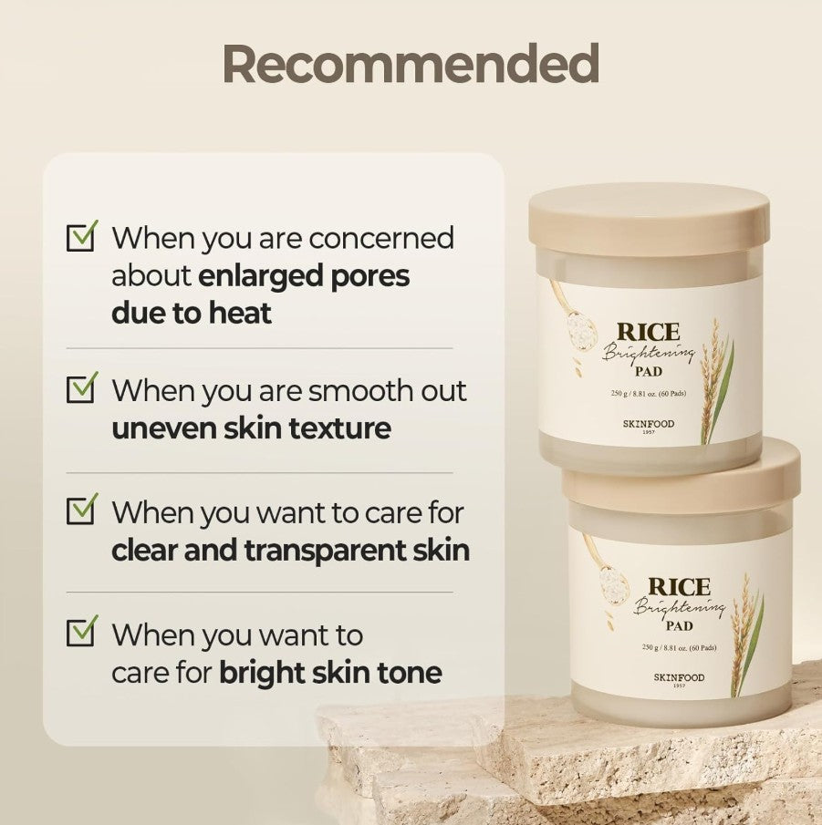 Discover the Convenience of Korean Rice Toner Pads for Radiant, Glowing Skin: Unlike liquid rice toners that require cotton pads, Skinfood’s Rice Pads are pre-soaked with a milky, nourishing rice water toner essence. These gentle toner pads tone, hydrate, and clear, delivering an effortless glass-skin glow with rice ferment extract and hydrating ingredients. 100% cotton pad provides gentle exfoliation, pore care, and skin clarity. Simply swipe or leave on targeted areas for a brighter, more even-toned complexion and a boost in radiance—a perfect introduction to Korean skincare