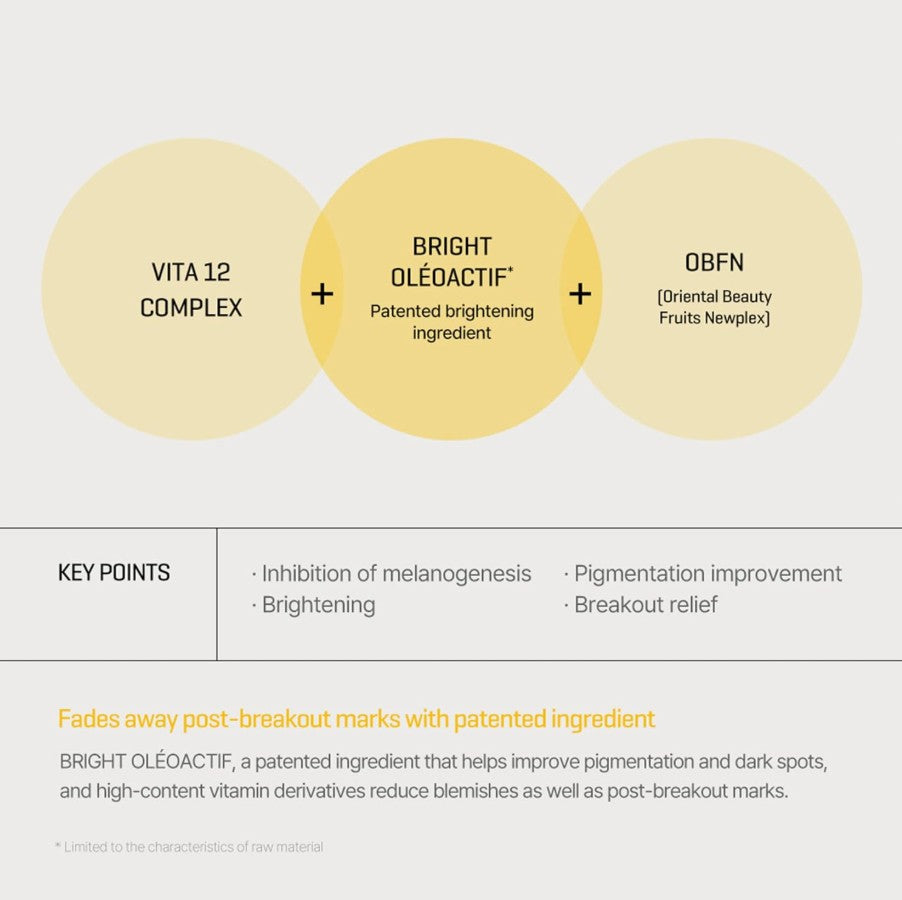 KEY INGREDIENTS : 10% of Niacinamide helps to improve the skin's overall texture, minimize the appearance of pores, regulate oil production, and enhance the skin's natural barrier function. 83% of Yuja extract contains natural fruit acids that can gently exfoliate the skin, promoting a smoother and brighter complexion. Additionally, The patented ingredient, BRIGHT OLÉOACTIF, functions to control sebum and reduce dark spots