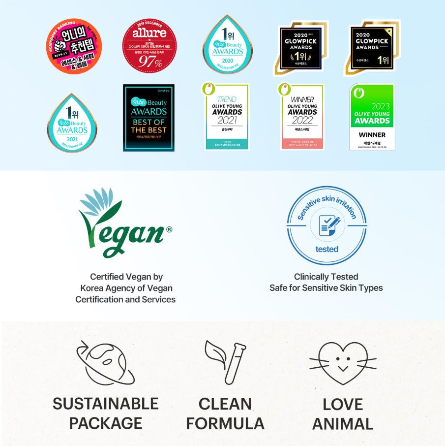 • [CLEAN BEAUTY] Our goal is to pursue clean, safe, and sustainable beauty for the future, and so we made our products certified VEGAN and use FSC Certified packaging. All of our products include no animal-derived ingredients or animal testing (cruelty-free).